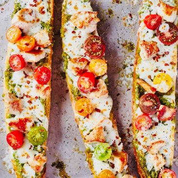 Pesto, Grilled Chicken, cherry tomato’s, green pepper, mozzarella cheese comes on a flat bread.